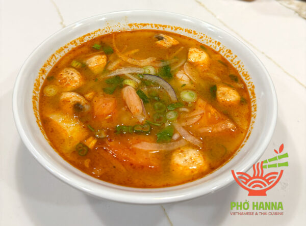 TOM YUM SOUP is a famous Thai soup known for its bold sour and spicy flavor, infused with lemongrass, kaffir lime leaves, galangal, and chili. The aromatic, flavorful broth combined with fresh seafood creates a vibrant and irresistible taste.