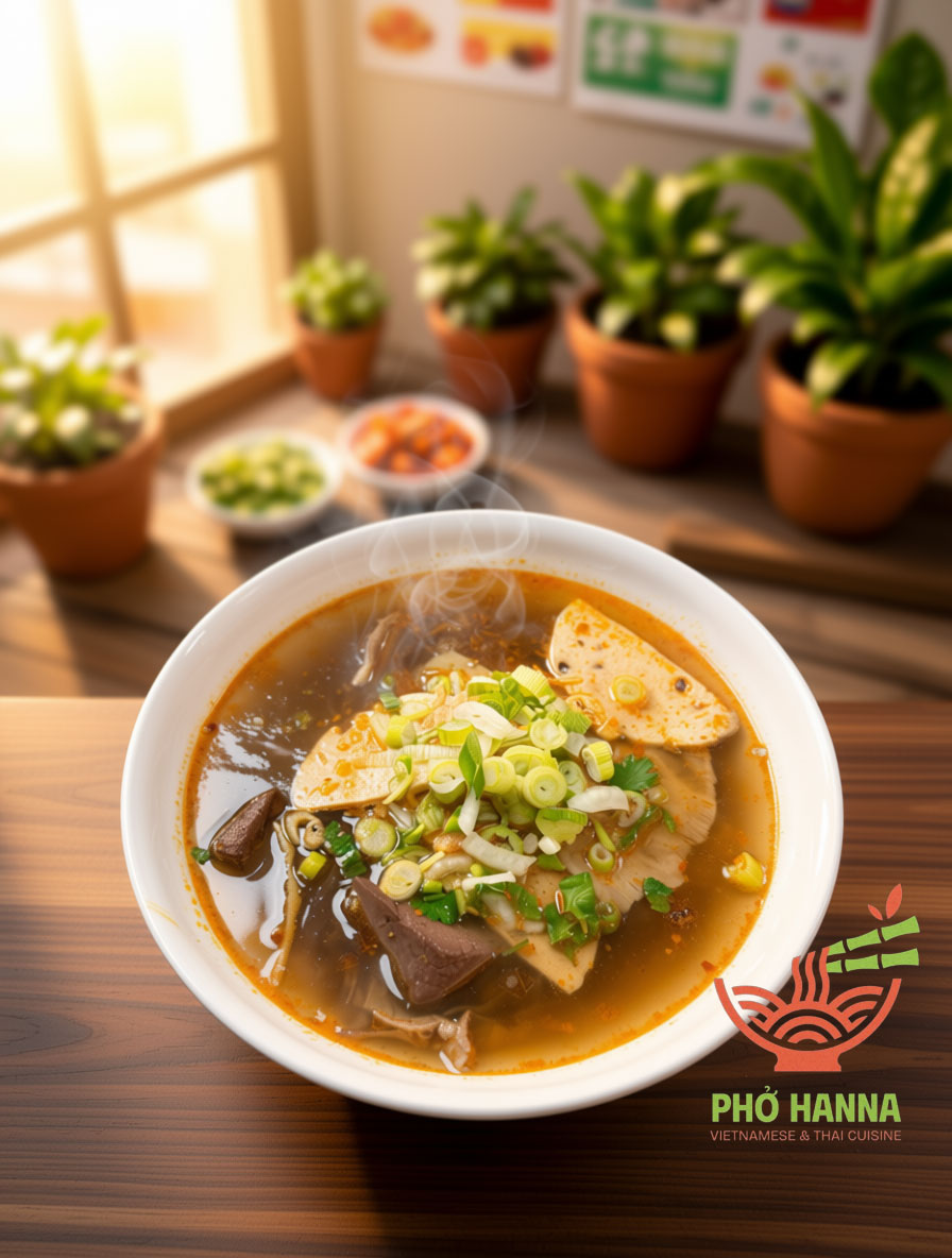 Hue Style Beef Noodle Soup – Tender slices of beef served in a fragrant, spicy broth inspired by the flavors of Hue, with rice noodles, fresh herbs, and crisp vegetables. A perfect balance of savory, aromatic, and slightly spicy notes.