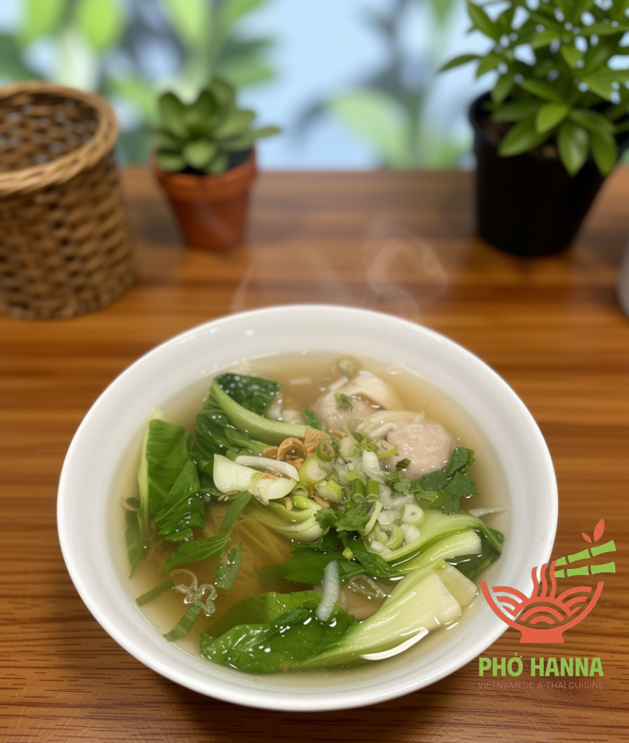 Wonton Egg Noodle Soup – Egg noodles served in a savory, flavorful broth, topped with tender pork and shrimp wontons, fresh vegetables, and aromatic herbs. A comforting bowl full of taste and texture.